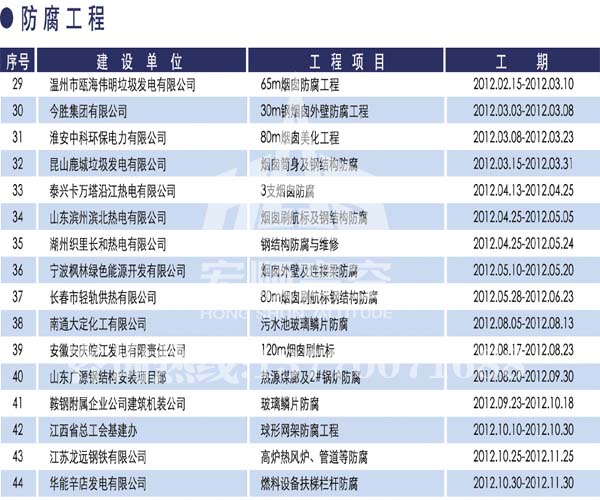 宏順建設(shè)工程有限公司是國家批準(zhǔn)成立的專業(yè)高空作業(yè)企業(yè):承攬過(國內(nèi).國外)煙囪新建、煙囪防腐、磚煙囪新建、煙囪改造、煙囪維修、煙囪脫硫防腐、煙囪拆除加高、煙囪滑膜等高空作業(yè)工程。具有“不搭腳手架 、 不需要停產(chǎn)”施工特點。